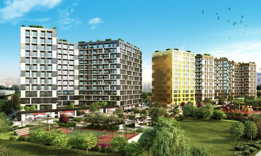 - العقارات المتاحة هي شقق (1 + 1) مع مطابخ مغلقة، (2 + 1) و (3 + 1) بنتهاوس، دوبلكس، و مخططات طابق ارضي مع حديقة.